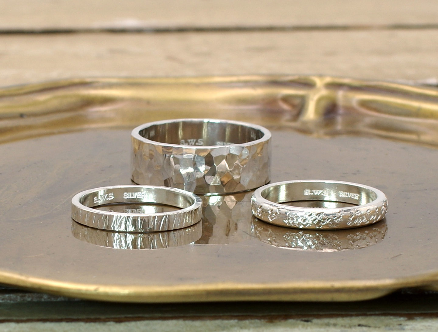 ◆リングサイズ/2号〜30号(種類によって対応サイズが異なります)・シルバーリング3種(ストレート、ラウンド、ワイド)ハンマーテクスチャー3種(リングライン、スクエアドット、メロン柄)リングとテクスチャーの組み合わせはお選びいただけます!またオプションで文字入れ、マット、いぶしなどアレンジも!